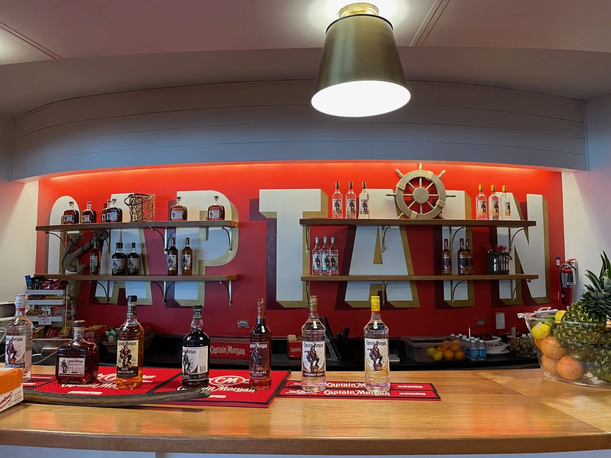 Inside the brand home, we embarked on a reimagining journey by constructing custom tasting tables that foster a communal experience, encouraging guests to gather and enjoy tastings together. Retail spaces have been revitalized with new millwork displays that beautifully showcase the brand's products, enhancing the shopping experience. An updated interior bar rounds out the transformation, providing a stylish and inviting focal point for guests to relax and enjoy their favorite Captain Morgan beverages. Together, these design elements create a cohesive and welcoming atmosphere that embodies the spirit of Captain Morgan.