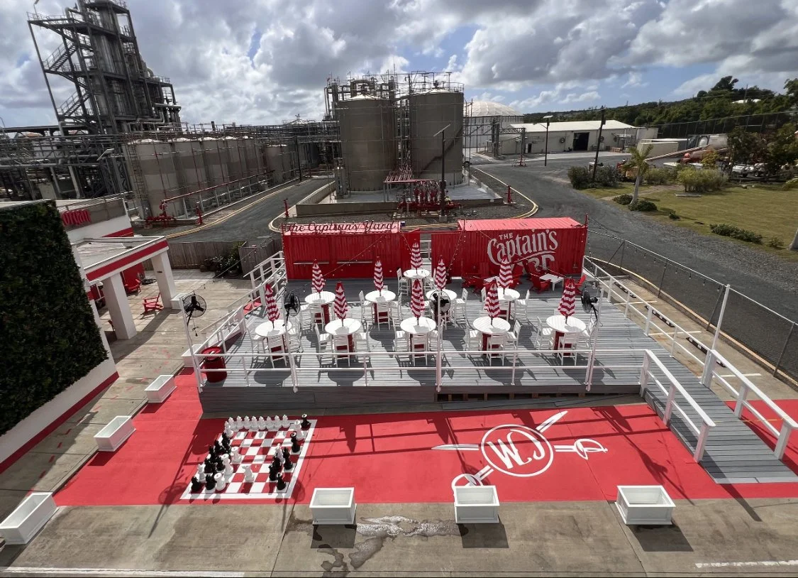 The Captain Morgan brand home in St. Croix, USVI, features a thoughtfully designed outdoor patio that integrates a custom container bar, effectively transforming the outdoor space to accommodate more guests. This innovative design includes a vibrant bar area, complemented by custom high-top tables crafted from repurposed oil drums, which not only enhance the rustic charm but also provide a unique seating arrangement for visitors to savor their drinks al fresco.