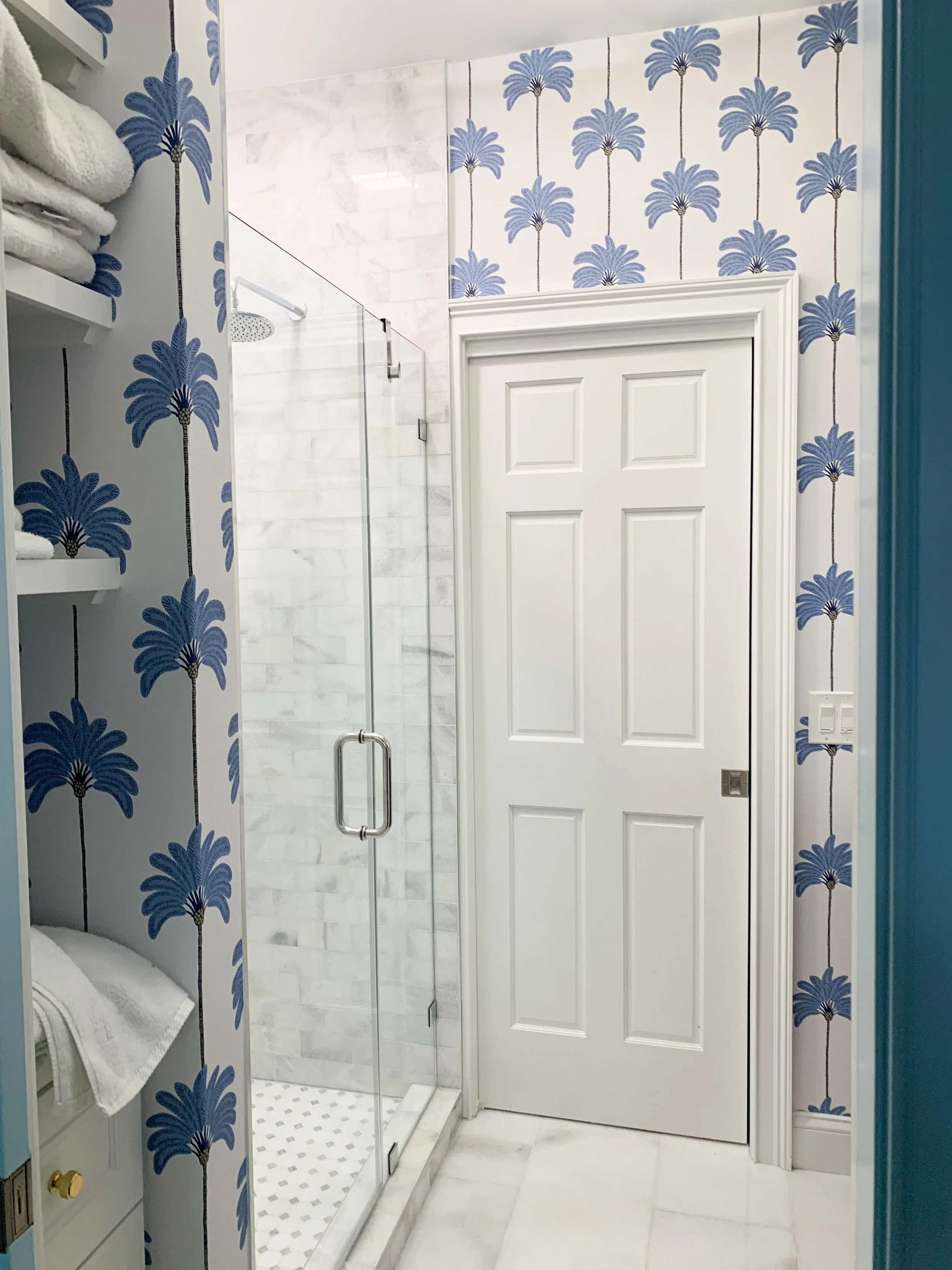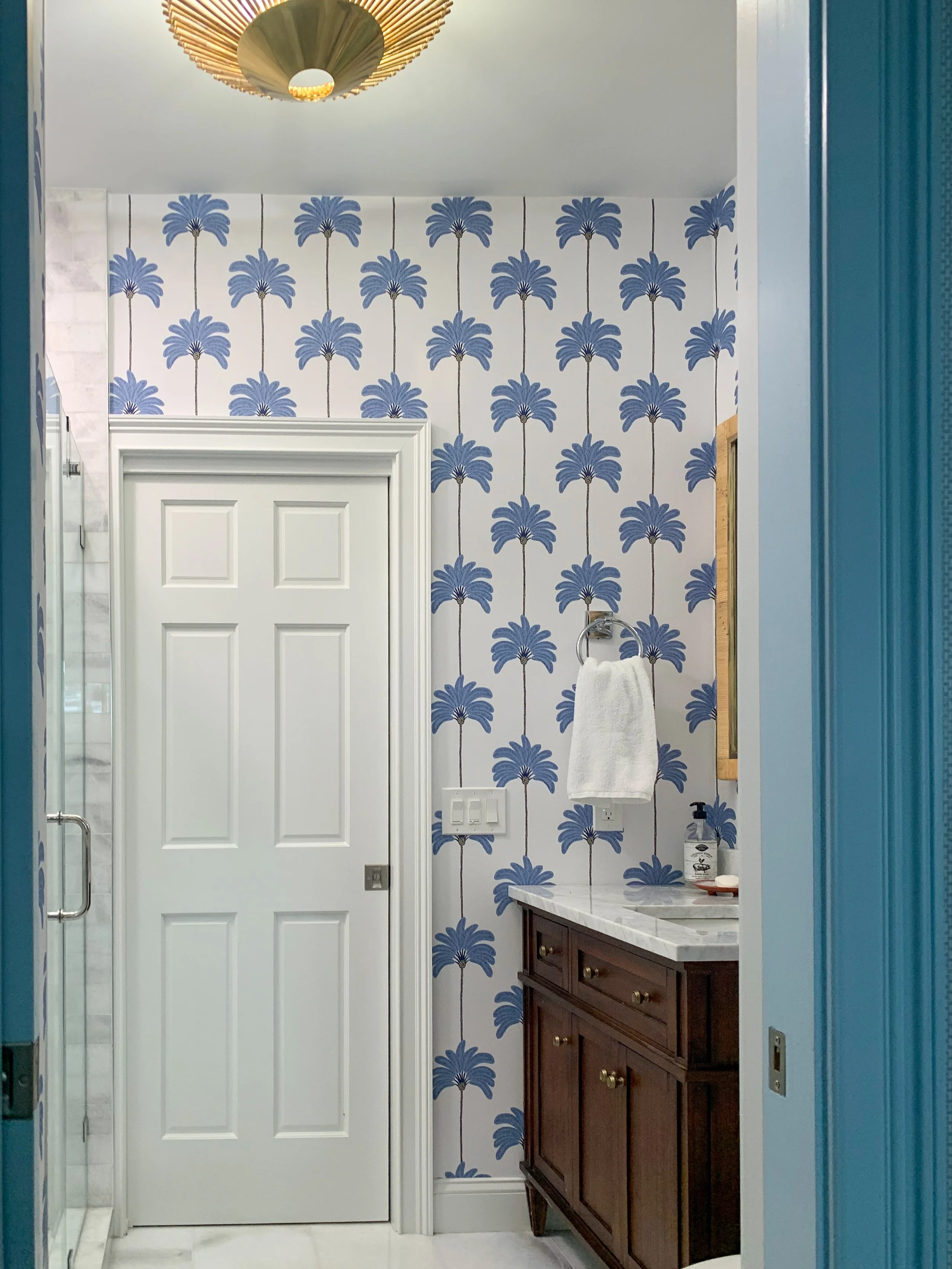 Stepping into the en suite bath reveals a delightful surprise—a striking blue palm wallpaper that echoes the lively spirit of the guestroom. The gorgeous marble tile floors and shower reflect elegance, their intricate patterns enhancing the overall sophistication. A walnut vanity provides warmth and practicality, complemented by brass accent lighting that casts a soft glow, making the space both inviting and stylish. This harmonious blend of design elements creates a welcoming retreat for guests, embodying both comfort and playful elegance.